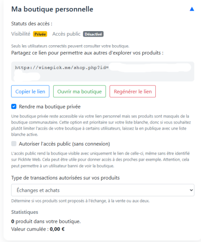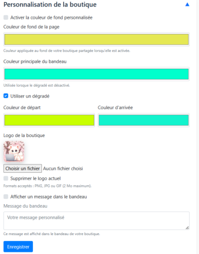 Avec une partie qui vous permet de configurer votre boutique personnelle. Comprenant vos objets proposés…. Choses que vous pouvez faire également directement depuis la page Ma Boutique