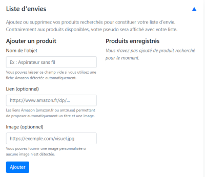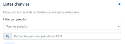 Dans la catégorie Produits vous avez accès aux listes d'envies de nos membres et à celle des produits proposés par tous (sauf ceux qui vous ont bloquer l'accès) Par défaut, vos produits sont masqués.