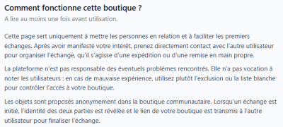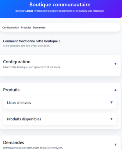 Une boutique communautaire permettant de découvrir les produits que les autres membres veulent échanger ou vendre.