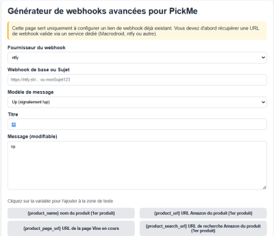 Rendez-vous ensuite sur le générateur maison Vous choisissez ntsy comme fournisseur, puis vous tapez le sujet saisi précédemment (donc “TonPseudoVine” dans l'exemple). Reste à choisir le modèle en fonction du type de webhook souhaité, choisir le titre, le texte, puis générer.