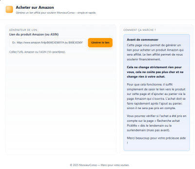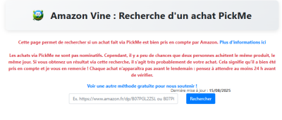 Il y a également une page pour faire des achats avec PickMe, votre invité n'aura qu'à suivre les instructions sur le côté pour pouvoir nous soutenir gratuitement en faisant des achats sur Amazon. Merci d'expliquer à vos proches l'importance de faire ses achats ainsi pour remercier du travail et aider à financer les plugins, c'est grâce à cela qu'ils peuvent eux aussi profiter de l'outil.