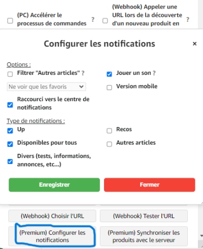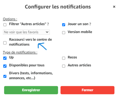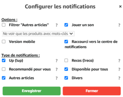 - Notifications d'évènements : Affiche une notification lors du signalement d'un nouvel objet “Disponible pour tous”, un up ou autre selon la configuration. Ca permet d'avoir des notifications directement du navigateur lorsqu'un produit apparaît dans un onglet qu'on a activé en notification. Sur mobile une notification push et sur pc windows.