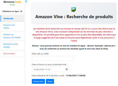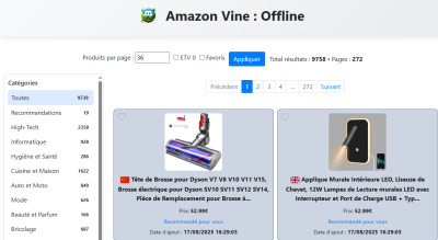 C'est une page qui simule la page Amazon Vine avec la navigation page par page et par catégories. Si vous recevez vos recos en message privé, cela vous affichera également vos recos sur la première page. Vous pouvez aussi utiliser un filtre pour ne voir que les produits à ETV0.