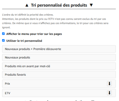 Permet de trier les produits des pages selon vos envies par ordre croissant ou décroissant des prix ou de l'ETV, en mettant les nouveaux produits en premier …