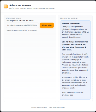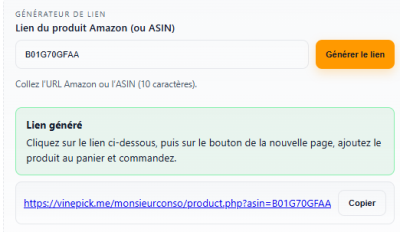 Il vous suffit de saisir le lien Amazon ou l'ASIN du produit dans la case prévue à cet effet et de générer le lien. Toutes les étapes sont décrites au fur et à mesure.