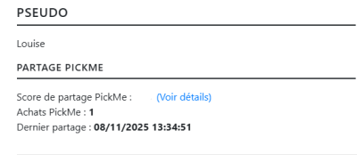 Une page récapitulant votre compte avec votre pseudo, statut, score de partage PickMe…