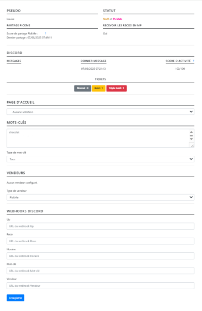 votre nombre de tickets à échanger sur le serveur, vous pouvez vérifier et modifier vos filtres et webhooks également ainsi que décider de votre page d'accueil PickMe Web.