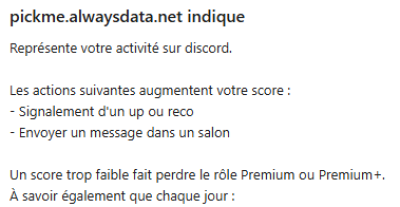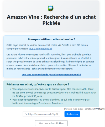 Réclamer un achat augmente votre score d'activité de 10 points (cela permet par exemple de maintenir votre Premium (+) plus longtemps sans être actif). La date d'achat est également prise en compte pour le passage AFK sur le Discord, il faut désormais n'avoir envoyé aucun message sur discord ou fait aucun achat via PickMe pour passer AFK sur discord.