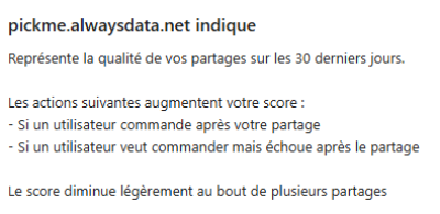 Ce score sert pour le classement hebdomadaire des 3 personnes ayant partagé le plus de produits utiles sur le serveur. Les gagnants ont droit à un booster qui leur permet de gagner 1,5 fois plus d'argent et d'xp pour monter les niveaux sur le serveur.
