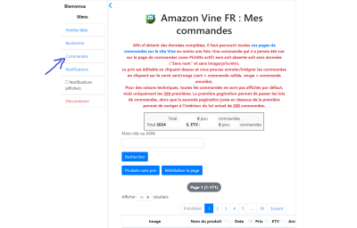 Une page commande avec la liste de vos commandes Vine :