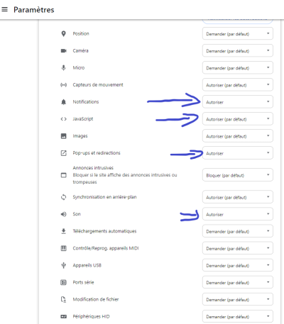 Et donnez les autorisations pour les notifications, java script, les pop-up et le son comme tel