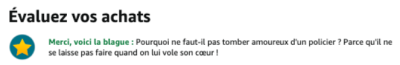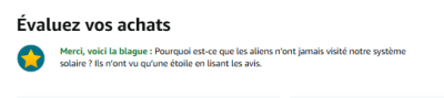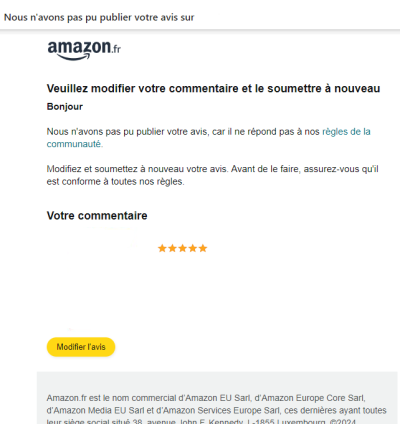 Il arrive que certains commentaires soient refusés, difficile d'en connaître la raison exacte, tout dépend des circonstances. Vous pouvez consulter les règles pour la rédaction des avis ci-dessous et reposter votre avis après l'avoir modifié. D'où l'intérêt de sauvegarder vos avis avec ReviewRemember pour pouvoir les retrouver et modifier plus facilement. vous trouverez le tuto de son installation là.