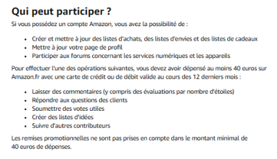Il faut savoir qu'il y a un montant minimum de commande sur Amazon pour pouvoir commenter des articles, ce qui s'applique aussi aux testeurs vine. Il vous faut donc commander pour 40 euros minimum par an pour faire partie du programme, les cartes cadeaux n'étant pas prises en compte.