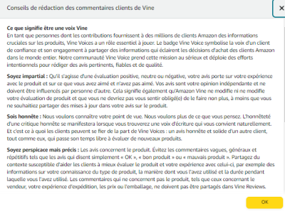 Il s'agit d'un message qui s'affiche lorsque vous voulez commenter un produit directement sur la page produit, pour que votre commentaire soit pris en compte il faut passer par la page d'avis Amazon Vine.