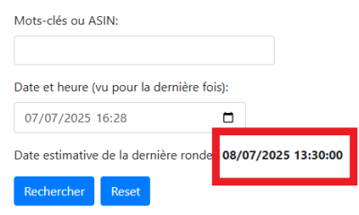 Une date et heure de la dernière fois que votre favori a été vu est indiquée à côté du produit. selon la couleur vous avez déjà une indication, si c'est rouge c'est qu'il a été vu il y a plus de 24 heures et n'est probablement plus disponible, s'il est noir il faut se référer à l'heure de la dernière ronde et s'il a été vu avant il n'est probablement plus disponible ou la personne ayant fait la ronde l'a déjà pris elle même. Si c'est bleu il a été vu récemment.Si vous ne le trouvez pas sur la page ou il est noté et où vous êtes envoyé il peut être dans les pages adjacentes. Cela dépend du nombre de produits que la personne l'ayant vu en dernier a commandé ou de l'ajout potentiel de produits entre deux.